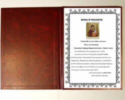 Czasami zamawiający chcą zrobić prezent bliskiej osobie na konkretną okazję i termin, a czasu do jej wykonania jest bardzo nie wiele. Stąd też pracownia wypisuje dokument opisujący zamówioną ikonę oprawiony w elegancką okładkę. Sama ikona pojawia się nie co później. Ważnym jest aby ikona została napisana w spokoju, z modlitwą i dokładnie.